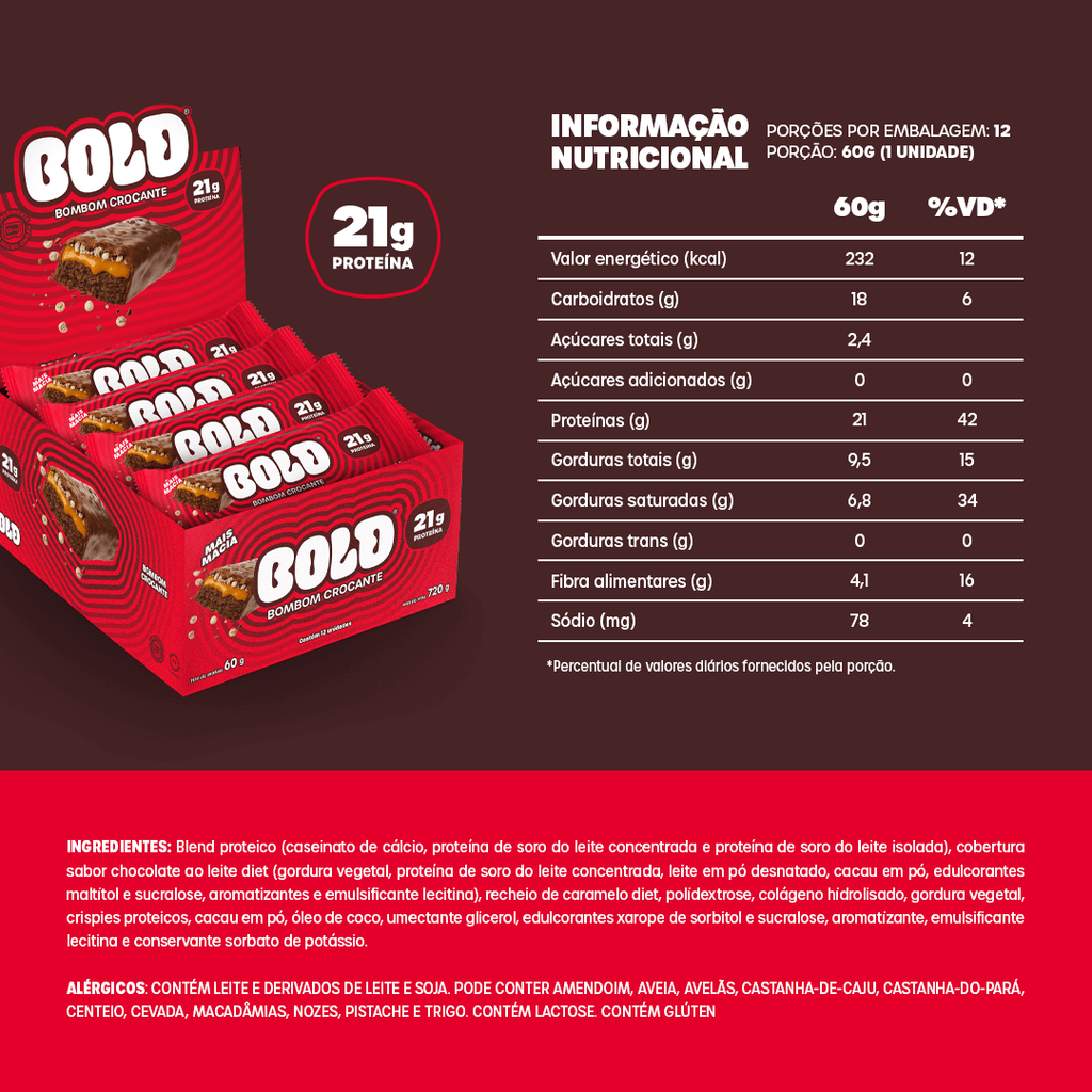 Se você está em busca de uma maneira irresistível de combinar sabor e nutrição no seu dia a dia, a nova BOLD BOMBOM CROCANTE é a escolha certa! Essa barra de proteína combina o sabor único do bombom crocante com a cremosidade que só as barrinhas BOLD têm! Perfeita para dar energia no seu lanche pré-treino ou para repor as energias no pós-treino.