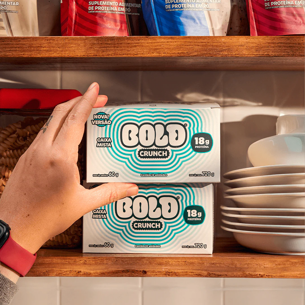 Com a correria do dia a dia, nem todas as pessoas têm tempo ou acham prático consumir ovos, leite ou whey para bater sua meta de proteína diária. Pensando nisso, a BOLD traz uma solução prática e deliciosa. Nossas barras de proteína BOLD Crunch possuem uma textura crocante e um recheio generoso que satisfazem sua vontade de comer um doce, sem a culpa dos açúcares e calorias não funcionais.